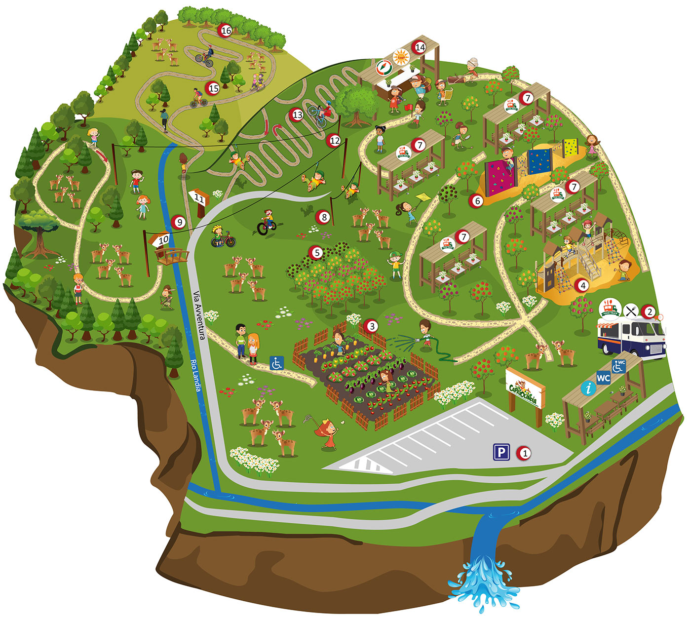 1 Parcheggio 2 Punto ristoro 3 Orti didattici 4 Castello 5 Frutteto didattico 6 Percorso di arrampicata 7 Gazebo ristoro (riservato) 8 Briefing Zip-line 9 Percorso Mountain-bike Baby 10 Partenza Sentiero nel Bosco 11 Partenza Sentiero degli Ulivi 12 Mega Zip-Line “Il volo del falco” 13 Percorso Mountain-bike 14 Partenza Orienteering / Campo base Summer Camp 15 Percorso Trekking / Mountain Bike 16 “7 Ulivi”